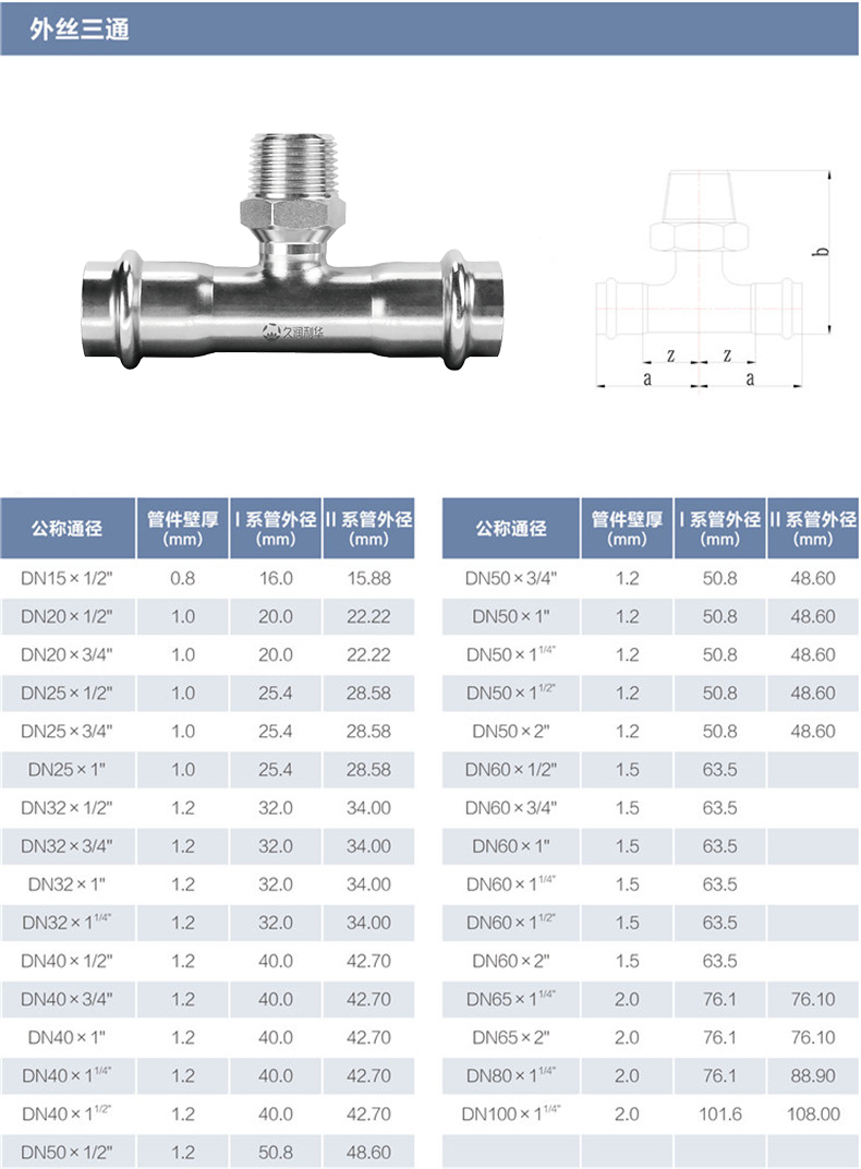 外絲三通丨材質(zhì)(Grade): 304/304L、316L 丨原料來(lái)源(Source of raw materials): 全部符合相關(guān)國(guó)家標(biāo)準(zhǔn)要求,用料來(lái)源酒鋼、太鋼、張浦、東特等 丨焊接方式(Welding method): 氬弧焊或等離子焊(TIG OR PLASMA在線)+氬弧焊(TIG離線) 丨執(zhí)行標(biāo)準(zhǔn)(Executive standard): GB/T 19228.2-2011 GB/T12771 丨參數(shù)對(duì)照表(Parameters):