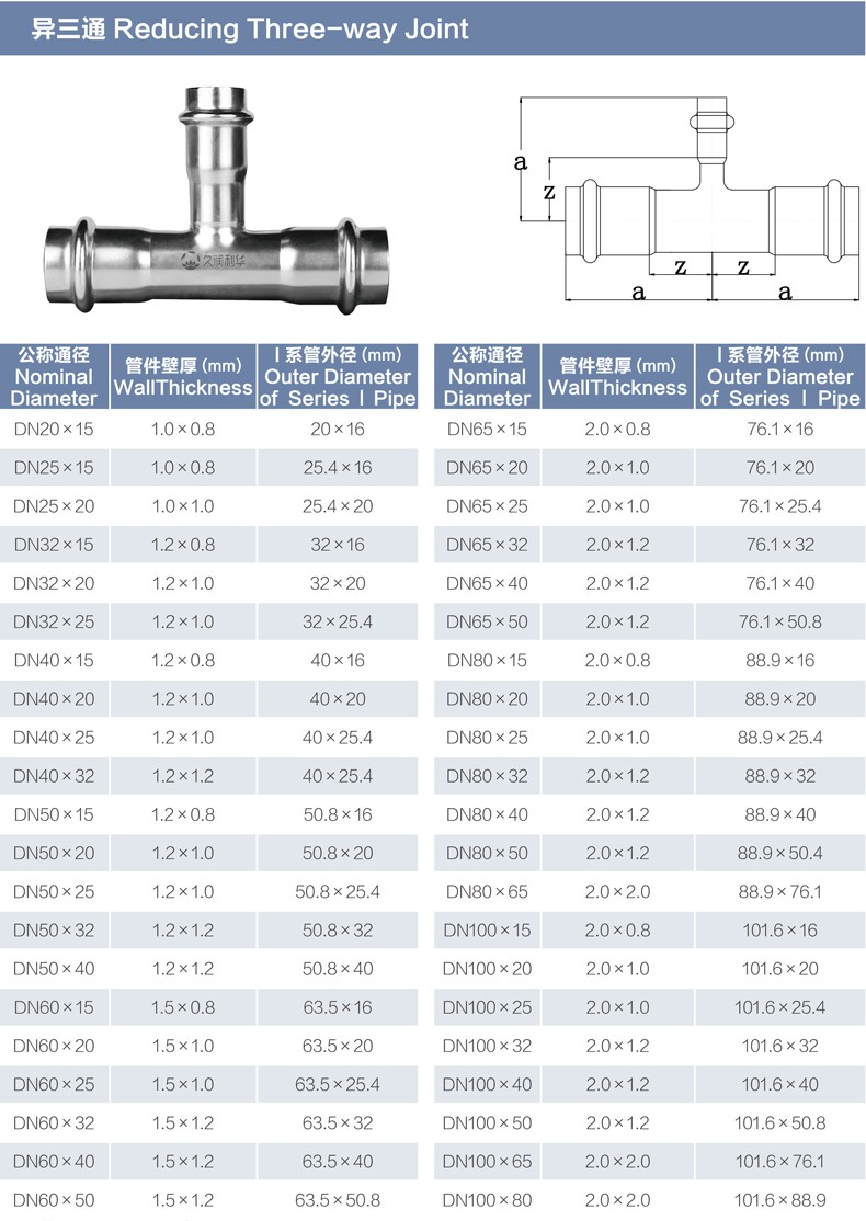 異接三通丨材質(zhì)(Grade): 304/304L、316L 丨原料來源(Source of raw materials): 全部符合相關(guān)國(guó)家標(biāo)準(zhǔn)要求,用料來源酒鋼、太鋼、張浦、東特等 丨焊接方式(Welding method): 氬弧焊或等離子焊(TIG OR PLASMA在線)+氬弧焊(TIG離線) 丨執(zhí)行標(biāo)準(zhǔn)(Executive standard): GB/T 19228.2-2011 GB/T12771 丨參數(shù)對(duì)照表(Parameters):